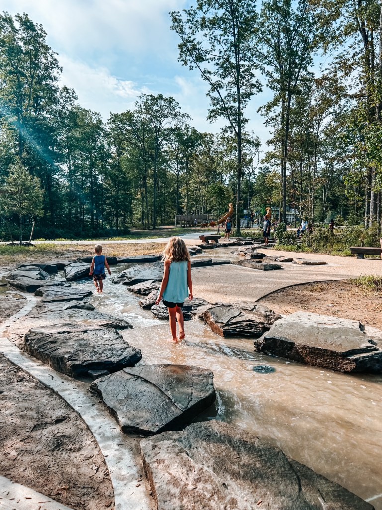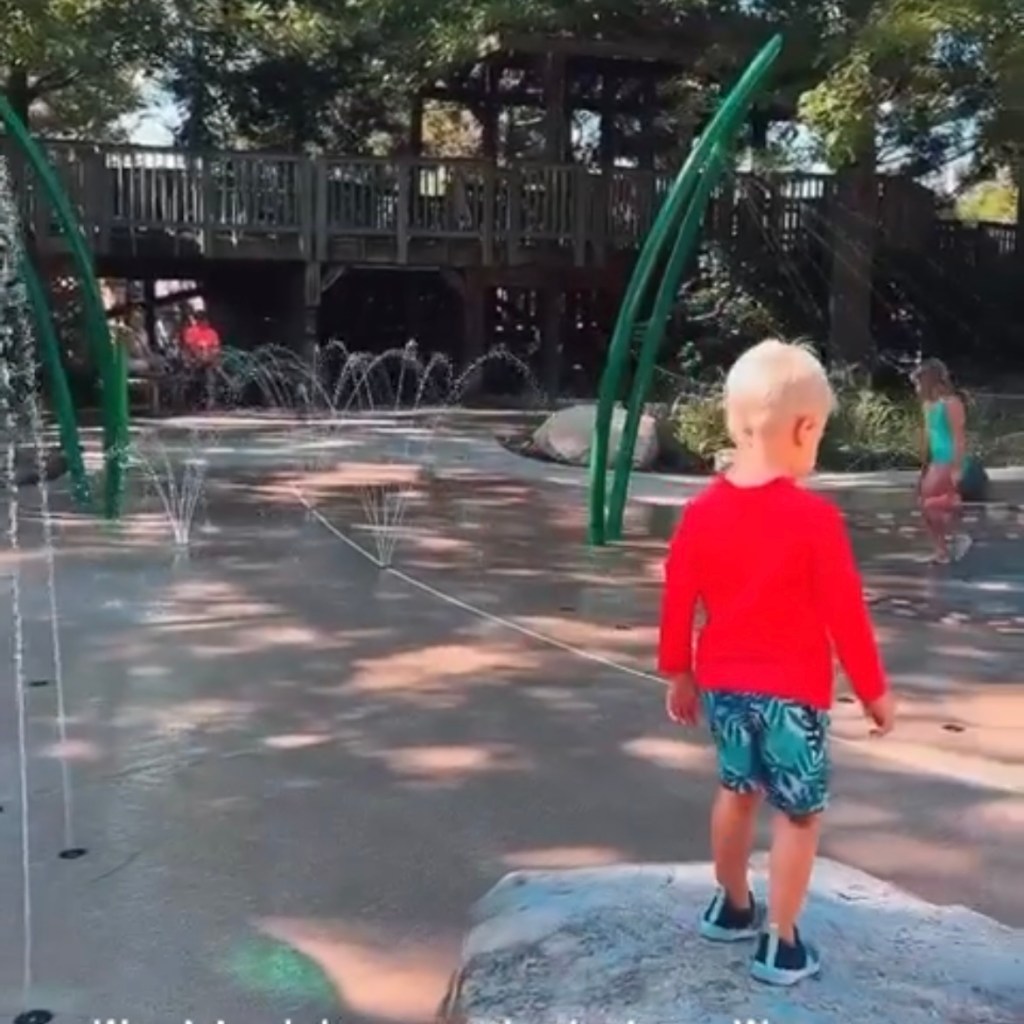 - I recommend wearing water shoes so kiddos can easily run between the splash pad, playground, and interactive stream.
