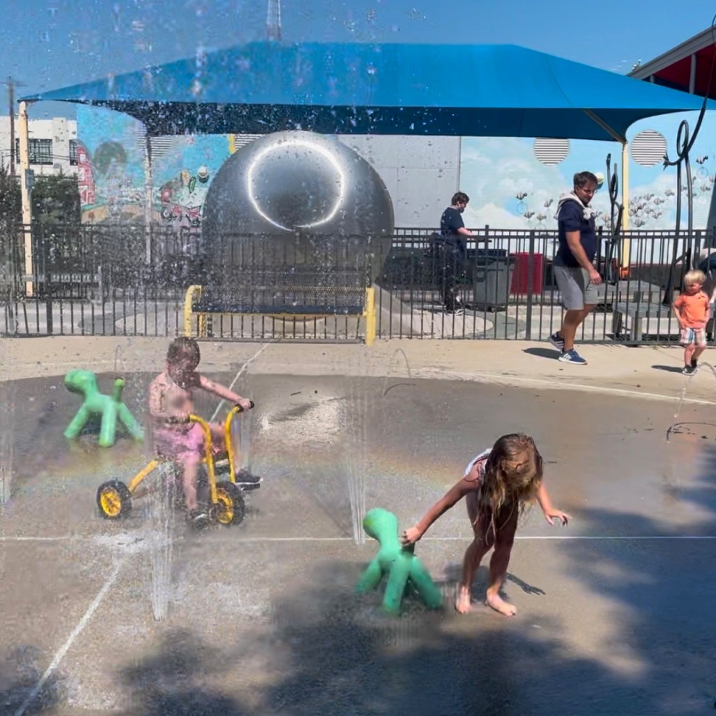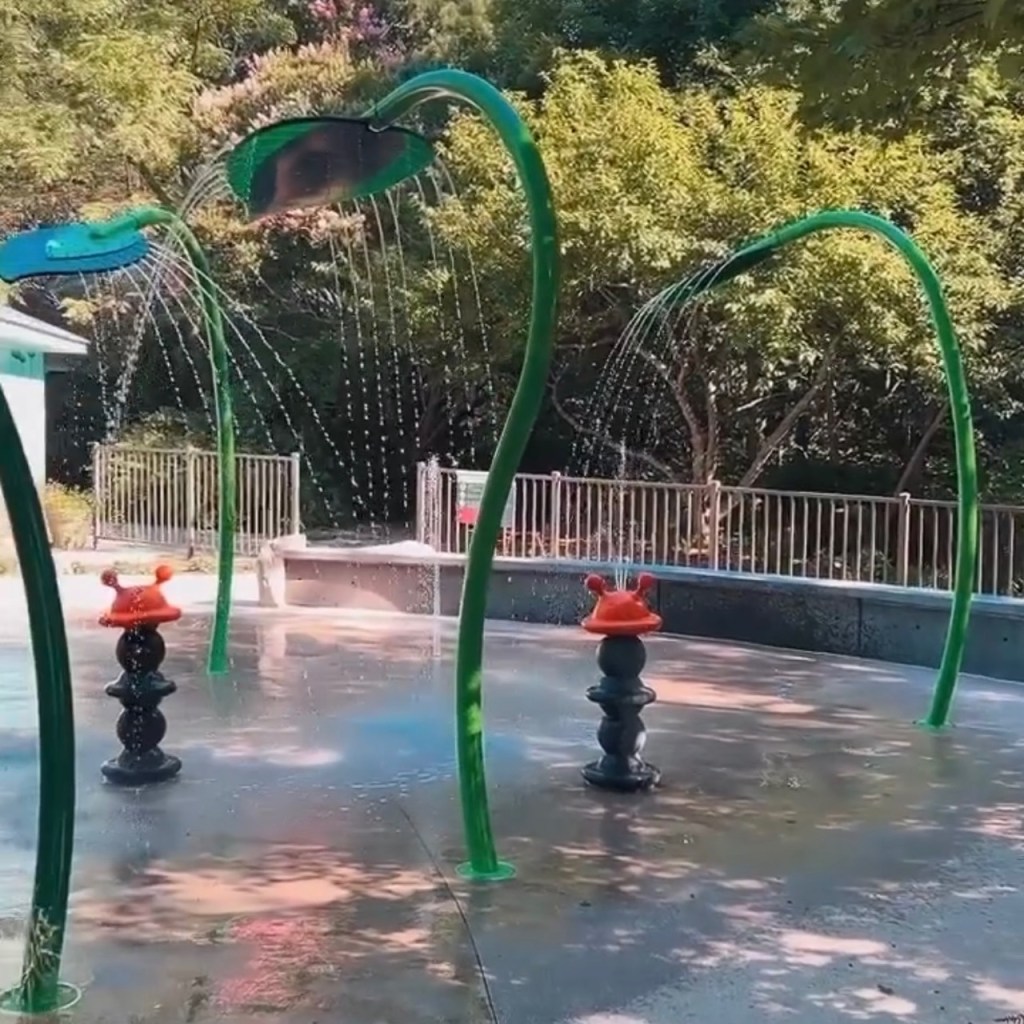 - The water spouts here feel stronger than some other splash pads. It also gets VERY crowded here and I’ve often seen field trips with bus loads of kids. Keep an eye out for little ones especially.